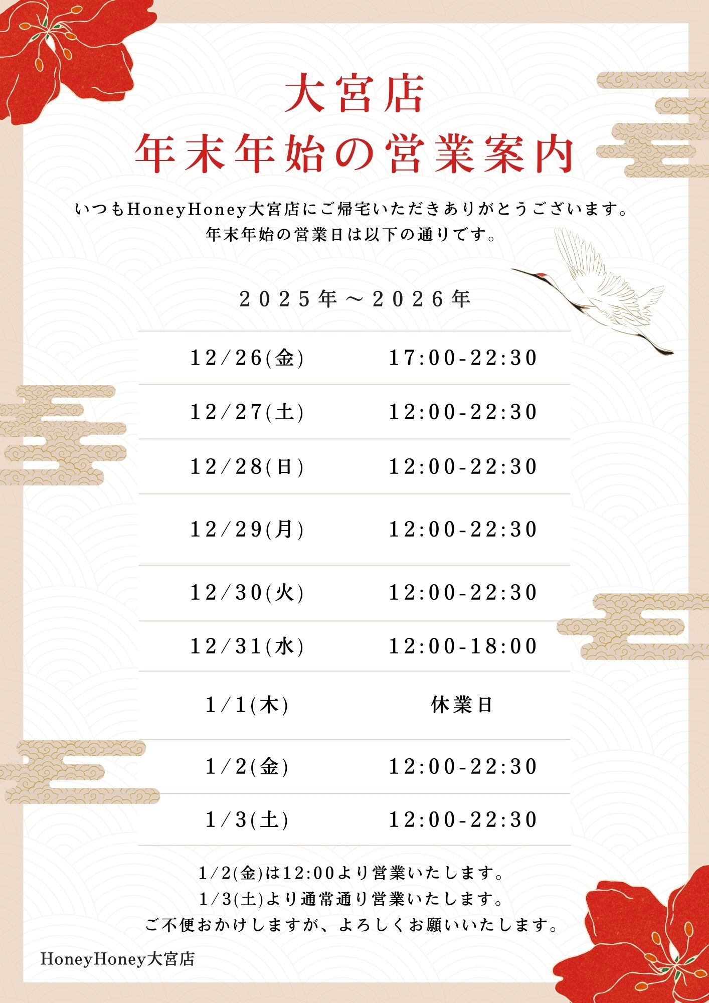 2025年 12月 25日 カテゴリー:お知らせ 【大宮店】年末年始の営業について 【大宮店】 年末年始の営業について 年末年始は下記のスケジュールとなります。 2025年は沢山のご帰宅ありがとうございました。 2026年もどうぞよろしくお願い致します。