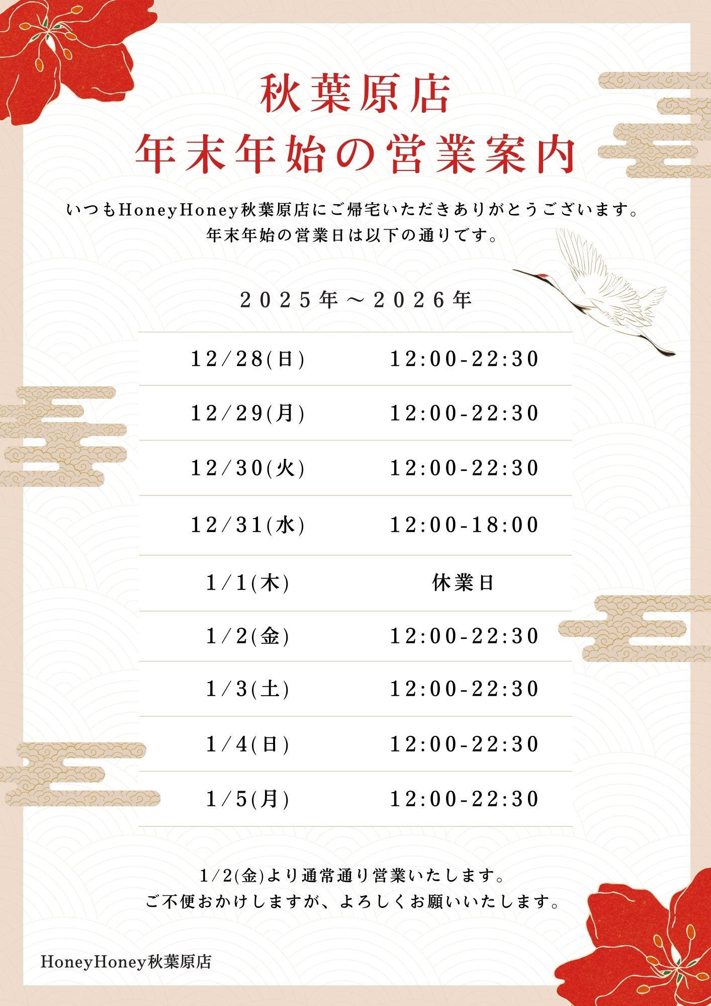 2025年 12月 25日 カテゴリー:お知らせ 【秋葉原店】 年末年始の営業について 【秋葉原店】 年末年始の営業について 年末年始は下記のスケジュールとなります。 2025年は沢山のご帰宅ありがとうございました。 2026年もどうぞよろしくお願い致します。