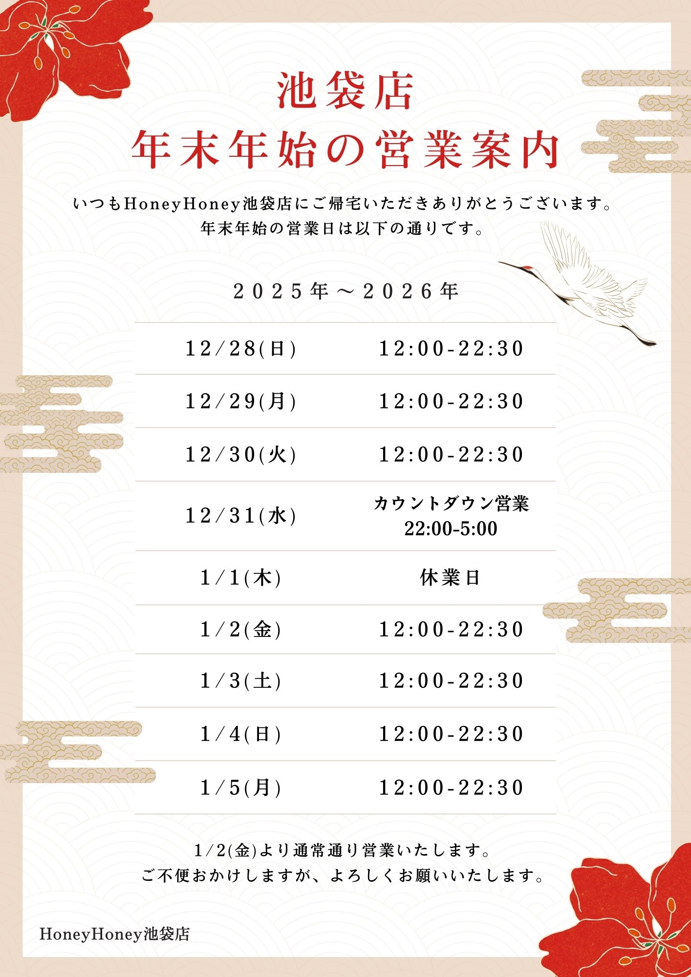 2025年 12月 25日 カテゴリー:お知らせ 【池袋店】 年末年始の営業について 【池袋店】 年末年始の営業について 年末年始は下記のスケジュールとなります。 2025年は沢山のご帰宅ありがとうございました。 2026年もどうぞよろしくお願い致します。